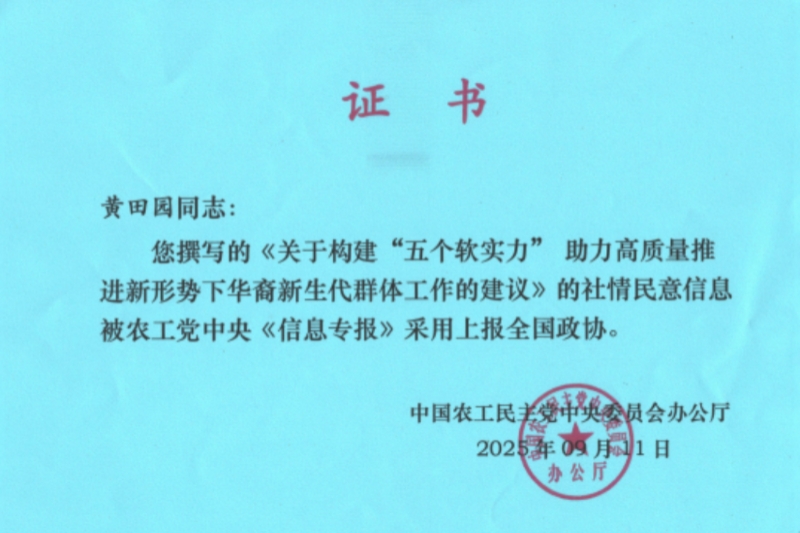 海南热带海洋学院人文社会科学学院教师、农工党党员黄田园撰写的社情民意《关于构建“五个软实力” 助力高质量推进新形势下华裔新生代群体工作的建议》被农工党中央《信息专报》采用上报全国政协。《信息专报》作为农工党中央级参政议政核心渠道,汇总农工党内专家成果,直接对接全国政协、中央统战部等高层决策机构,近年来已有多篇建议转化为国家部委专项政策。