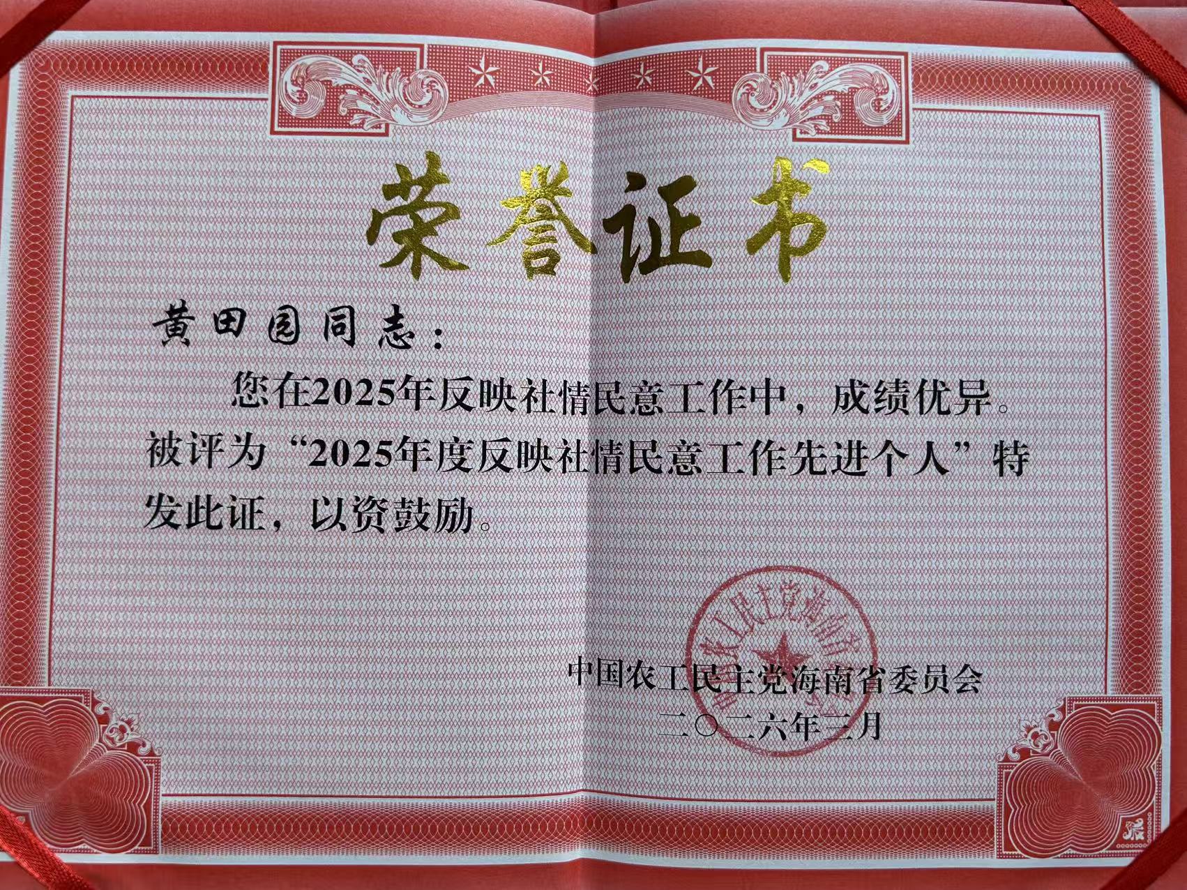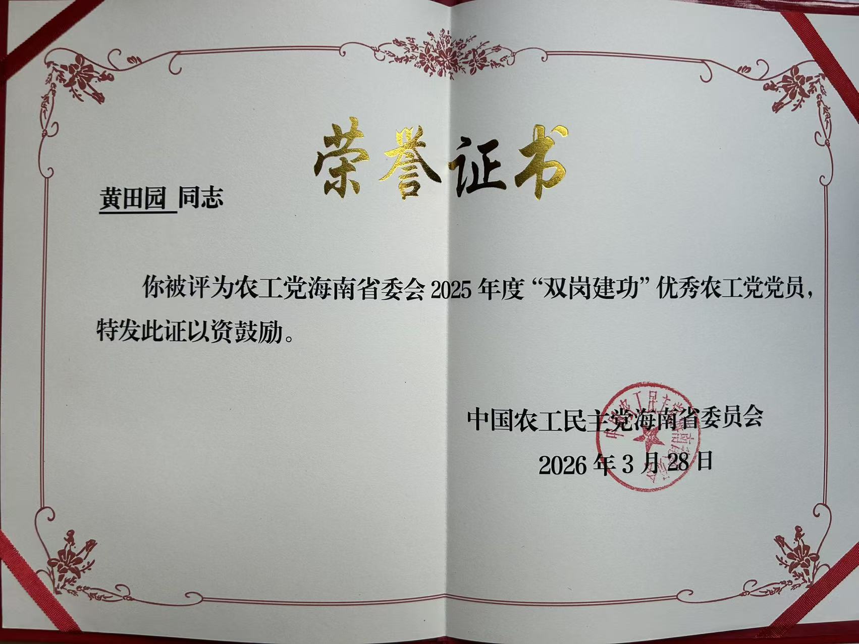 我校人文社会科学学院教师、农工党党员黄田园,凭借扎实履职与突出表现,获评农工党海南省委会2025年度“双岗建功”优秀农工党党员和2025年度反映社情民意工作先进个人两项荣誉,充分展现了我校民主党派成员的良好风采与责任担当。